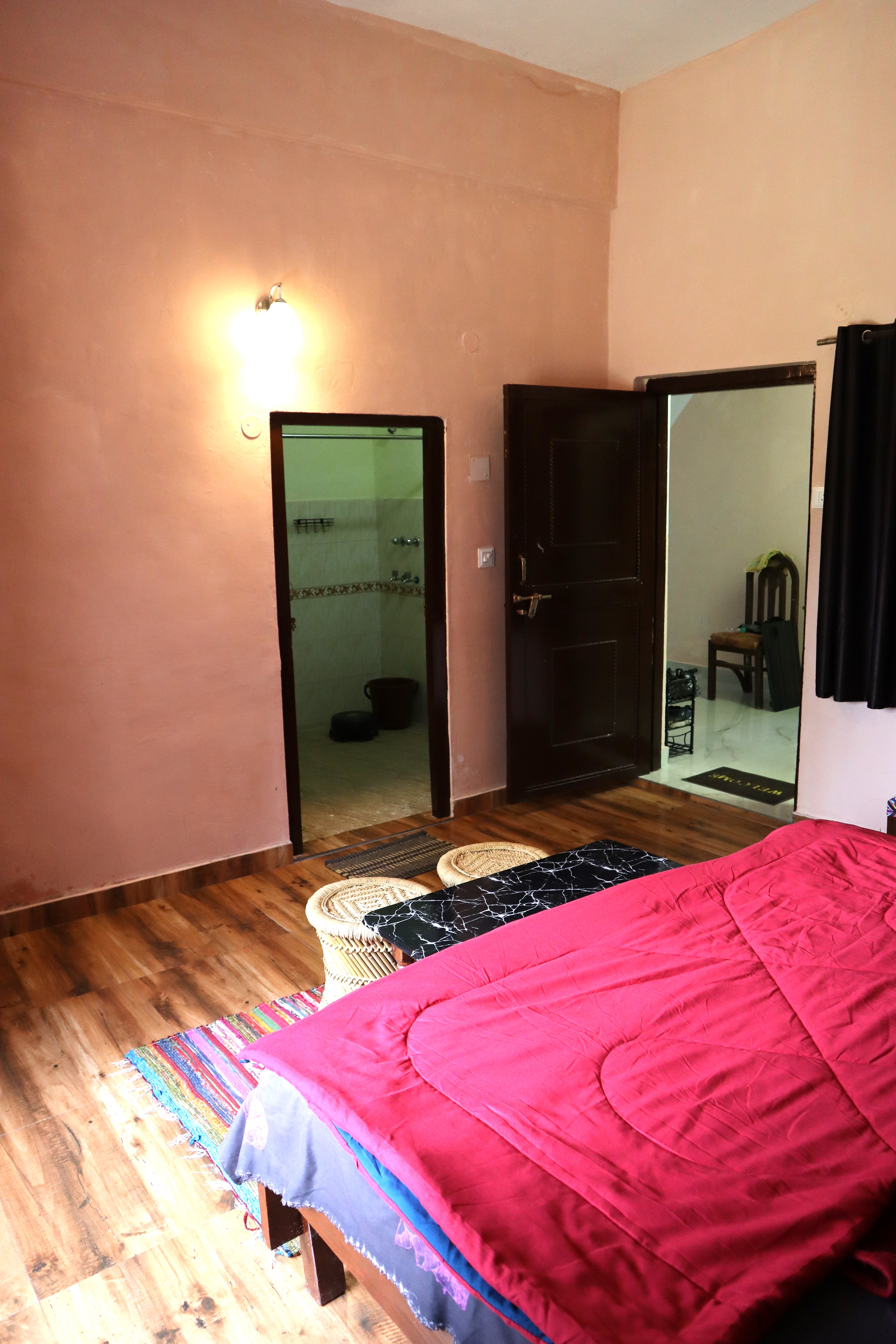 Welcome to the Minty Fresh Room – a green retreat that’s cozy, bright, and full of zest! Along with a double bed, fresh linen, pillows, chairs, table, almirah, lamp, and work desk, it features a private washroom with geyser and its own mini kitchen setup with induction, utensils, and sink so you can whip up meals anytime. Open your windows to refreshing mountain, and lawn views, making every moment feel fresh, homely, and rejuvenating.