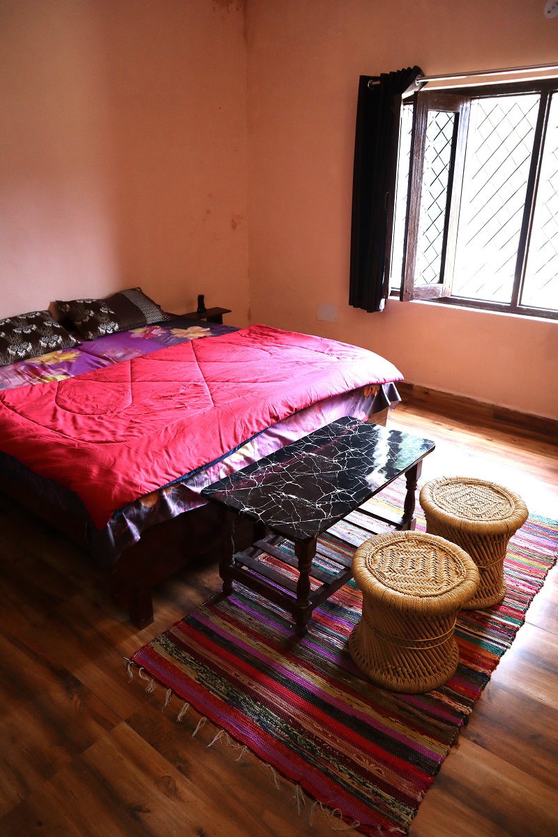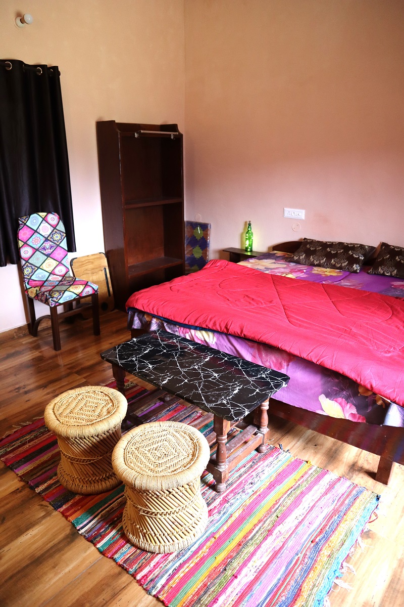 Step into the Groovy Grape Room – a purple-toned haven that’s as vibrant as it is relaxing! Enjoy a double bed with fresh linen, pillows, chairs, table, almirah, lamp, and a dedicated work desk for work or journaling. Your private washroom with geyser adds ease to your stay. Open the window to soak in majestic mountains, flowing river, and lush valley views – perfect for a groovy getaway filled with color, calm, and a dash of fun!