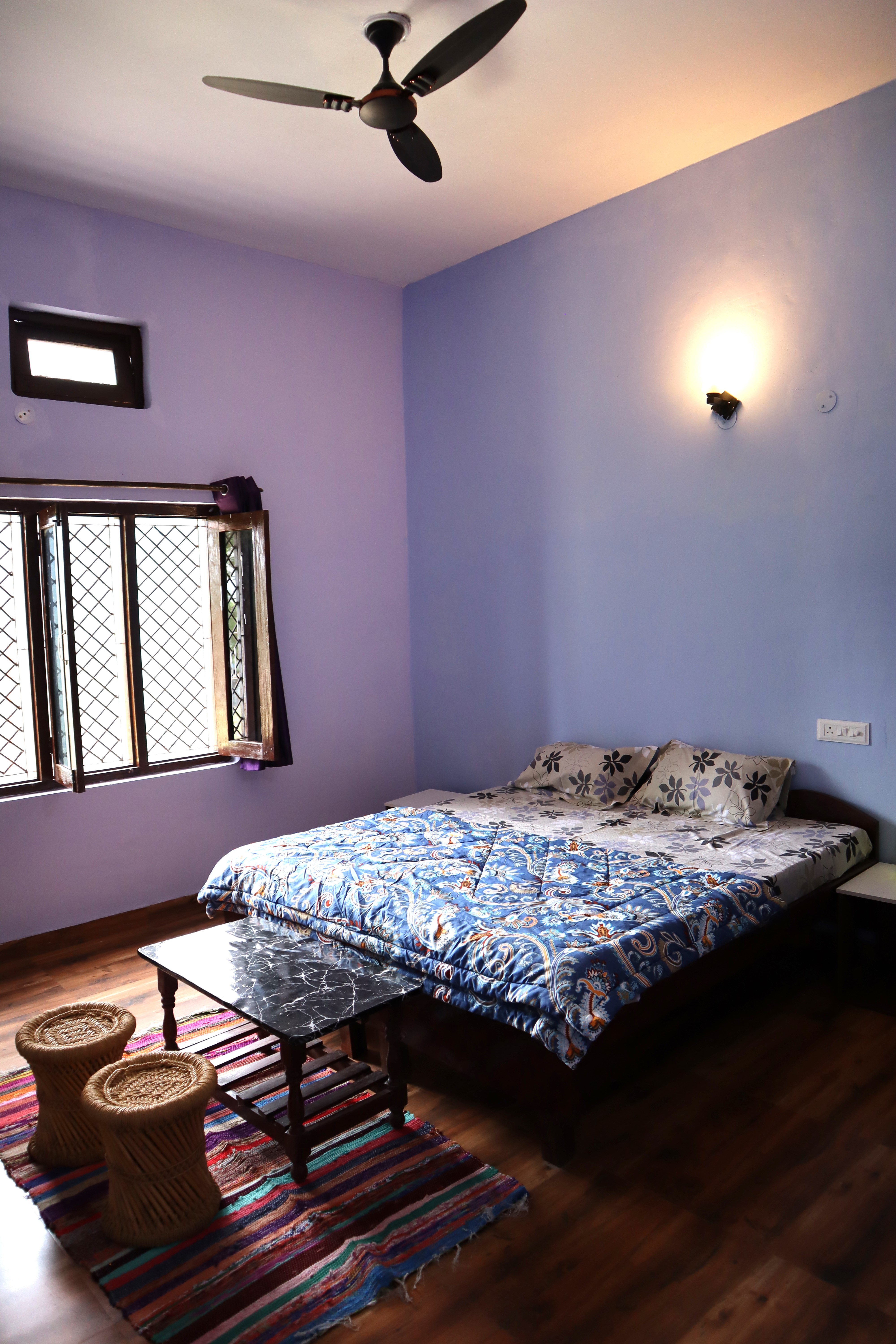 Step into the Blueberry Bliss Room, where calm blue tones meet homely comfort. This room offers a double bed with fresh linen, pillows, chairs, table, lamp, almirah, and dedicated work desk, along with a private washroom and geyser. For added convenience, it comes with a mini kitchen setup with induction, utensils, and sink, perfect for self-cooking. Large windows open to serene mountain and lawn views, filling your stay with peace and a hint of blissful charm.